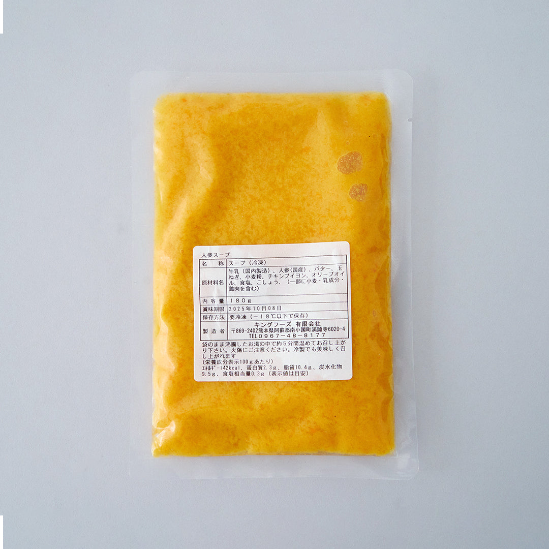 原材料:牛乳(国内製造)、人参(国産)、バター、玉ねぎ、小麦粉、チキンブイヨン、オリーブオイル、食塩、こしょう、(一部に小麦・乳成分・鶏肉を含む)
